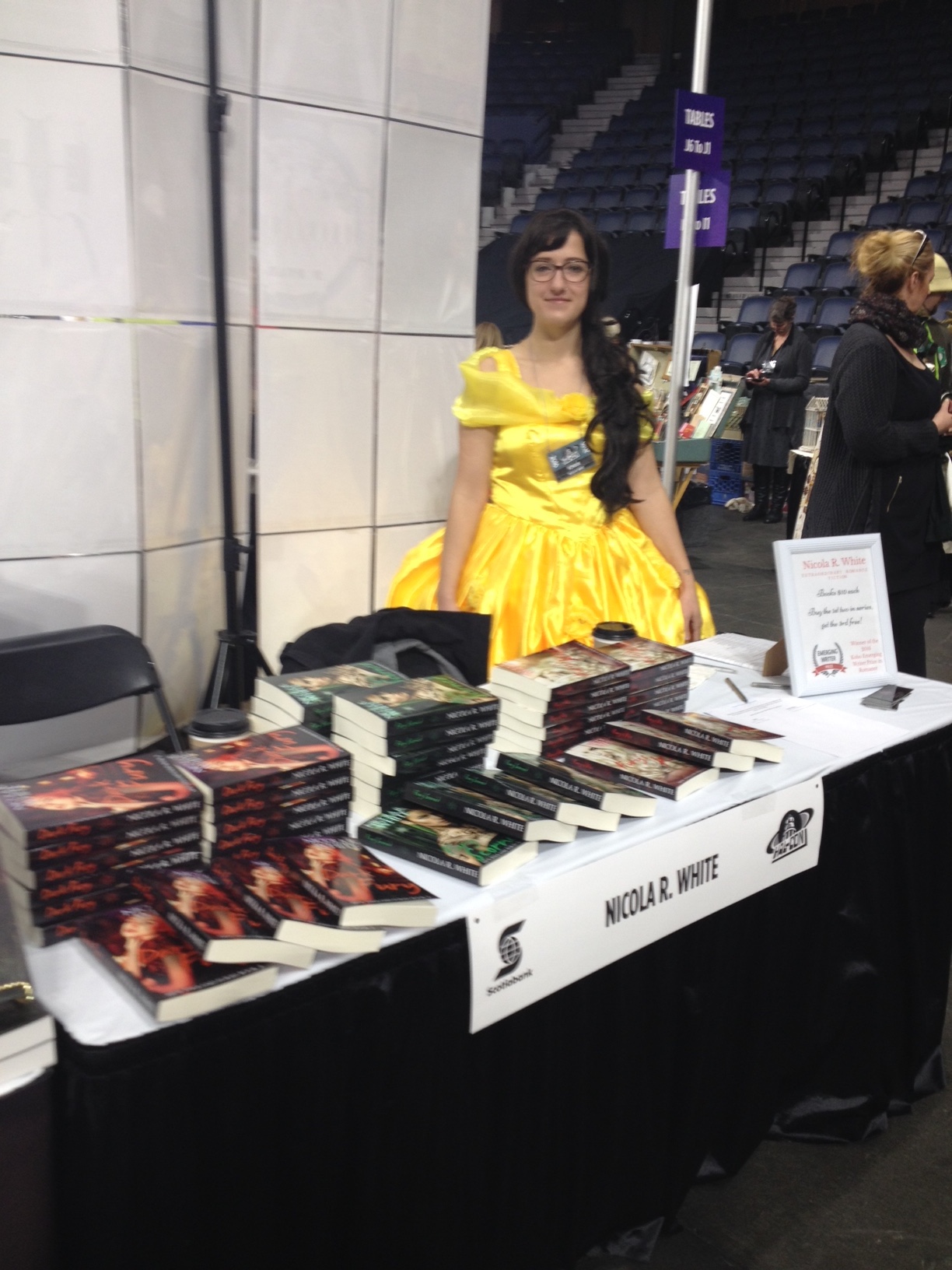 I recently appeared at Hal-Con, the biggest sci fi/fantasy conference in Eastern Canada, as a guest speaker and vendor and I had a ton of fun. I went all out and dressed as Belle from Beauty and the Beast on two separate days – I wore the famous yellow ball gown on Saturday and the blue peasant dress on Sunday – but I still didn’t hold a candle to some of the costumes I saw at the con.